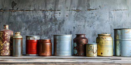 Assorted metal cans and jars for recycling promoting zero waste and reducing pollution at home. Concept Recycling, Zero Waste, Pollution Reduction, Metal Cans, Jars