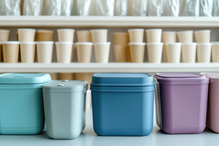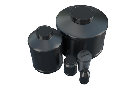 Three plastic containers: white, red and black, lined up next to each other, industrial packaging concept background.