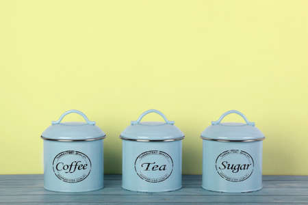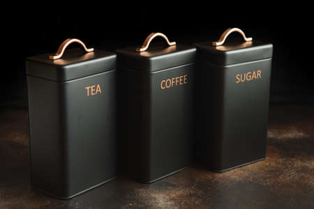 Sugar, coffee and tea metal jars on kitchen shelf