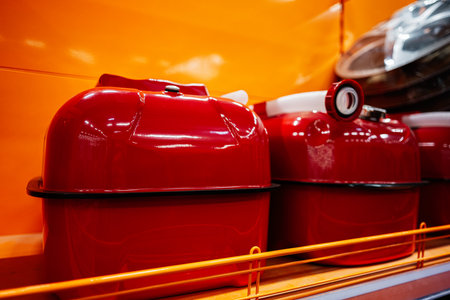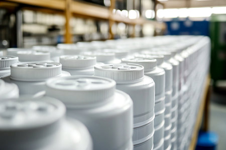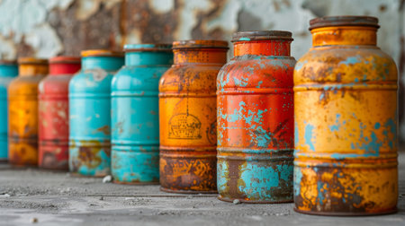 Close-up of some liquid cans stands on warehouse storage of chemical liquids. Background of storage containers in warehouse. Concept of warehousing and stored of goods. Copy ad text space for poster