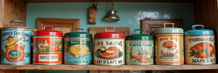 Vintage label food canisters on shelf in rustic kitchen setting.