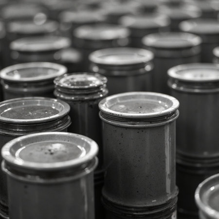 Various paint cans scattered in a vast, abandoned warehouse, setting an industrial atmosphere