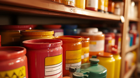 A close-up image of various chemical containers with warning labels, showcasing vibrant colors like red, orange, and yellow for safety identification.