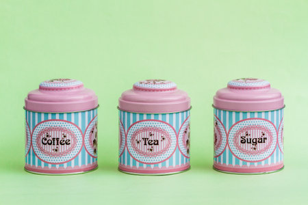 Colorful coffee, tea, sugar tin storage containers, kitchen organization, vintage design and practical functionality.