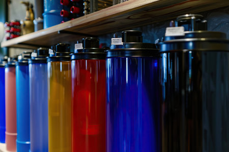 Brightly colored gas cylinders with shiny metallic fittings stand upright in a spacious industrial warehouse, creating a vibrant, organized storage sc
