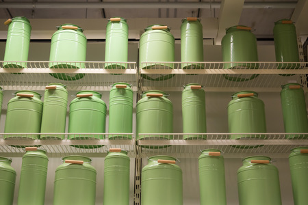 plastic cans of light green color in the warehouse, production, factory. Background from plastic canisters