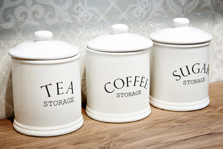 Porcelain jars for tea, sugar and coffee on kitchen