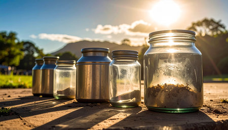 Two old aluminum jars on the ground with sunlight in the morning.