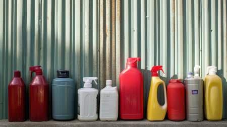 A vibrant assortment of cleaning and chemical containers lined up against a textured metal wall, showcasing diverse shapes and colors ideal for home or commercial use.
