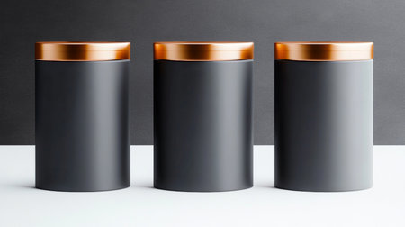 Elegant Gift Packaging Series Featuring Three Sleek Cylindrical Podiums with Copper Lids for Display