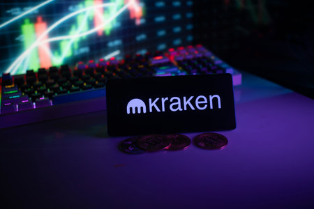 Dhaka, Bangladesh 18 September 2025:Illuminated Kraken logo on a phone with coins, trading screen in dim lighting