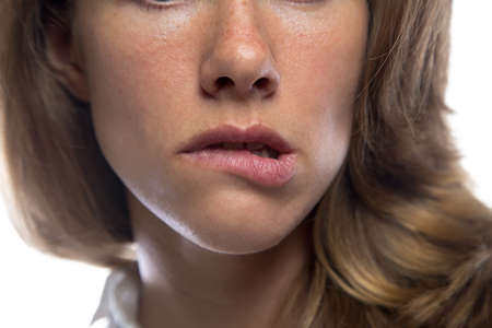 beautiful woman with lips virus infected herpes isolated on white background