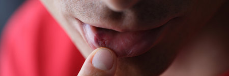On male lip herpes from inside closeup