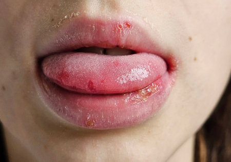 Herpes on the lip close up macro.