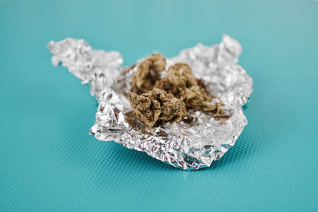 Green dry fresh marijuana in silver package on the green background.