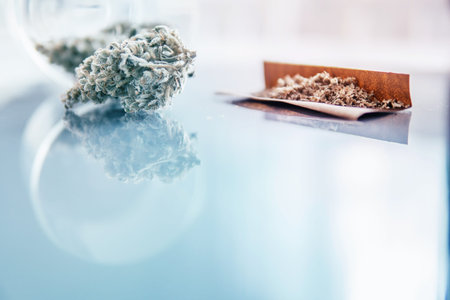 Close up of marijuana blunt with grinder. Cannabis use concept. Preparing and rolling marijuana cannabis joint. Rolling a marijuana joint.