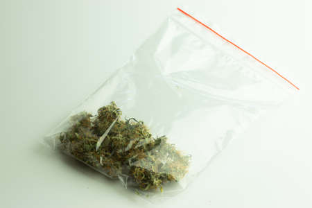 Street drug marijuana buds in zip lock on white background. Illegal cannabis business.