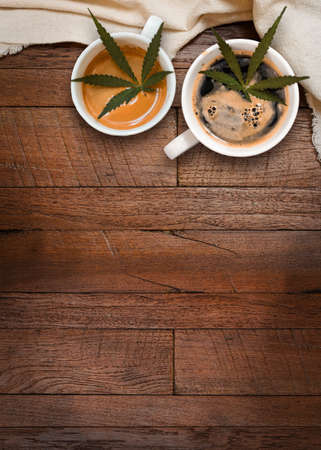 Cannabis coffee drinks. Marijuana, Cannabidiol (CBD oil), hemp leaf concept.