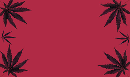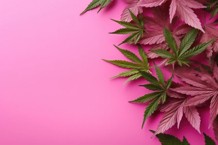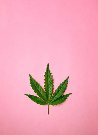 Cannabis leaves, marijuana leaves on pink background. Top view