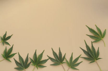 Cannabis background, flat lay. Fresh indica leaves, marijuana pattern isolated on beige background. Herbal medicine. Hemp recreation, legalization concept.