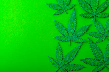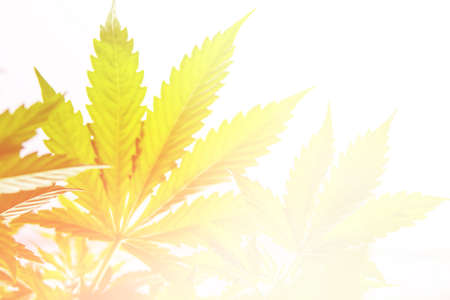 Cannabis is a standoff between a drug and a medicine. Green background of leaves.Close-up young hemp. Medicinal indica with CBD.Green cannabis leaves isolated on white background.