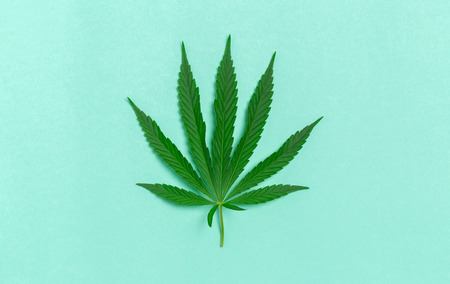 Green leaf of hemp isolated on mint color background. Medical marijuana concept.