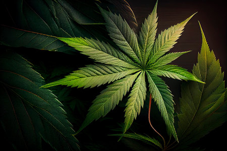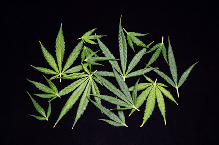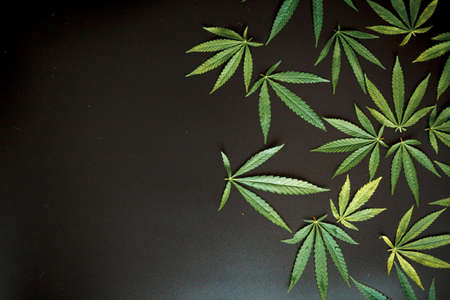 Cannabis is a standoff between a drug and a medicine. Green background of leaves. Medicinal indica with CBD.Green cannabis leaves on on black background