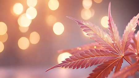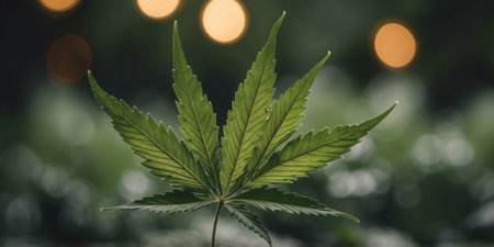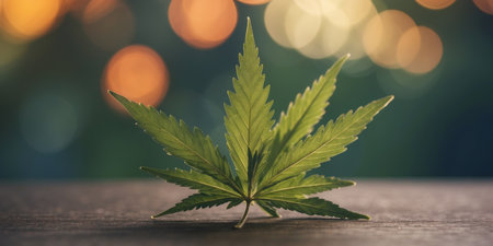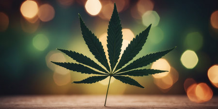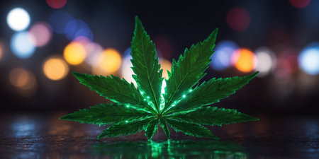 Cannabis leaf with lights bokeh background. Hemp legalisation. Marijuana cultivation.