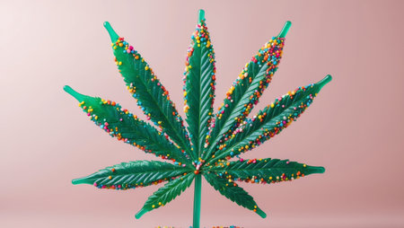 A vibrant cannabis leaf takes center stage amidst festive holiday decorations, creating a unique and eye-catching composition with tinsel and warm lights.