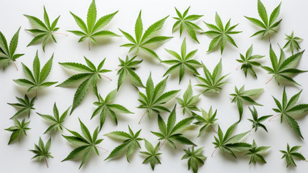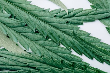 Top view of green cannabis leaves isolated on white background. Alternative medicine. Growing organic cannabis herb on the farm. Marijuana plantation for medical concept.
