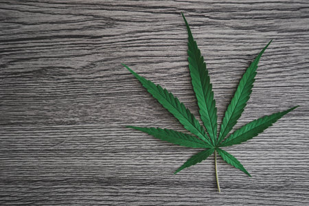 cannabis sativa leaf (marijuana) on rustic wooden background with copy space