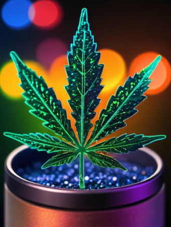 Photo Of Pot Cannabis Marijuana Symbols Glitters Green Blue And Fire Colors Illustration. Generative AI