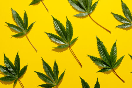 Marijuana leaf. Fresh cannabis plant on yellow background. Hemp recreation, medical usage. Weed legalization.