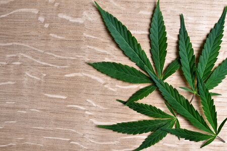Top view of cannabis leaf on wooden table. Space for text. Wood texture background. Hemp herb green leaves for medicinal. Farm marijuana plantation concept