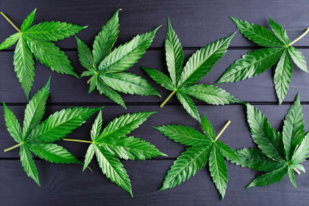 Leaf green marijuana hemp cannabis on blurred dark background