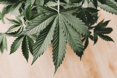 Large green leaves of a marijuana plant close-up. Background with copy space. Weed use in health care concept.