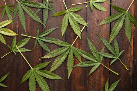 Cannabis green leaves on rustic wooden table