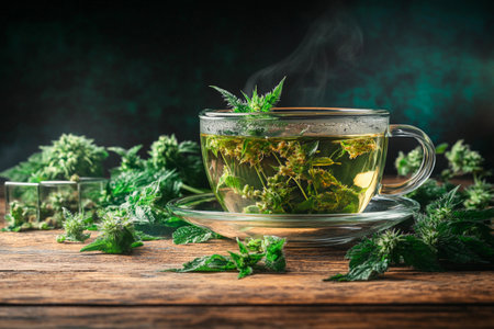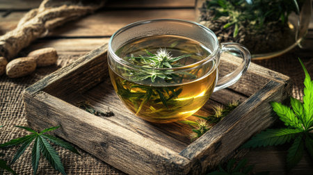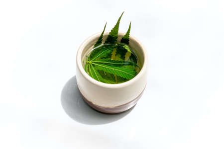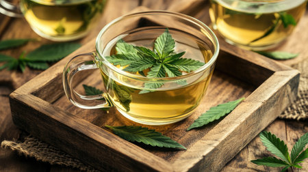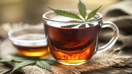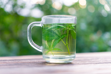 cannabis sativa hemp leaf hot tea herbal CBD healthy drink for relaxation