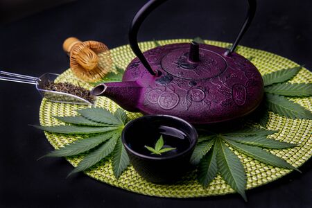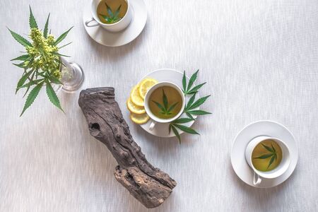 Hemp Tea. Cannabis herbal tea. Selective focus, copy space.
