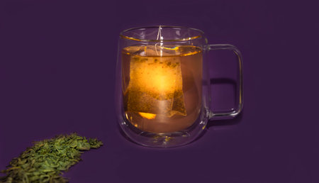 Cup of hot herbal cannabis or hemp tea in glass mug