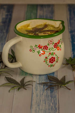 Cannabis herbal tea also known as weed tea, pot tea, ganja tea or a cannabis decoction