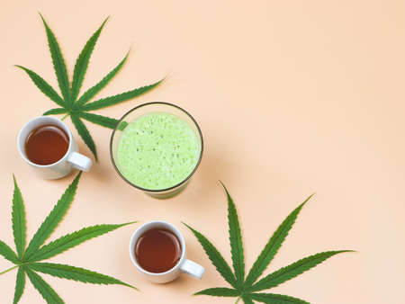 Top view or flat lay of two cannabis tea cups, a glass of cannabis smoothie and marijuana leaves on beige background.