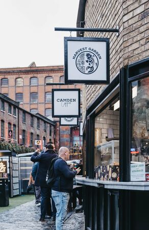 London, UK - November 26, 2019: Rows of food and drink kiosks inside Camden Market, London. Started with 16 stalls in 1974, Camden Market is one of the busiest retail destinations in London.
