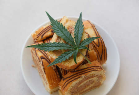 Sweet roll with marijuana oil on white plate. cannabis kitchen. Layout of delicious dessert, top view close up.