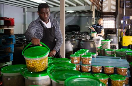 Afro-american male worker stocks plastic containers and cans with olives in warehouse
