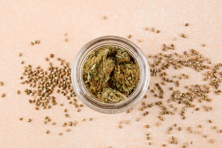 Marijuana seeds and buds flat lay. Medical marijuana and dietary supplement.