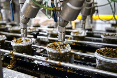 Seaweed salad on a conveyor belt. Automatic line for packing seafood