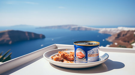 A closeup shot captures a can of tuna fish next to a bowl of the same, all set on a table overlooking the beautiful Santorini coastline on a bright day.