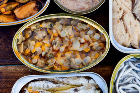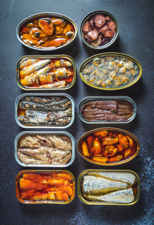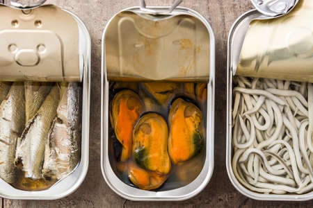 Assortment of cans of canned with different types of fish and seafood