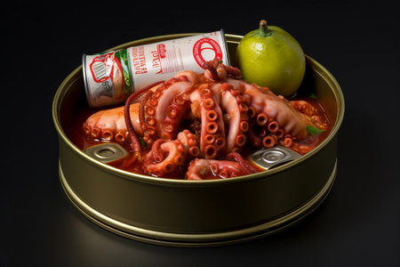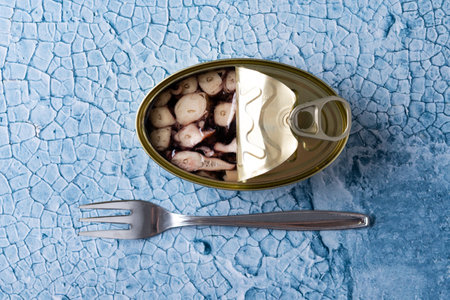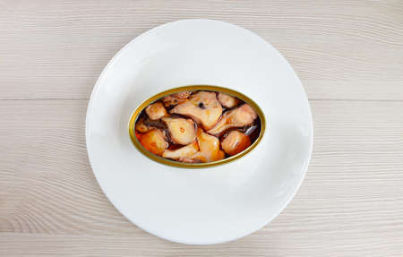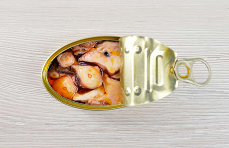 High angle shot of delicious can of preserved octopus in sauce on rustic wooden table